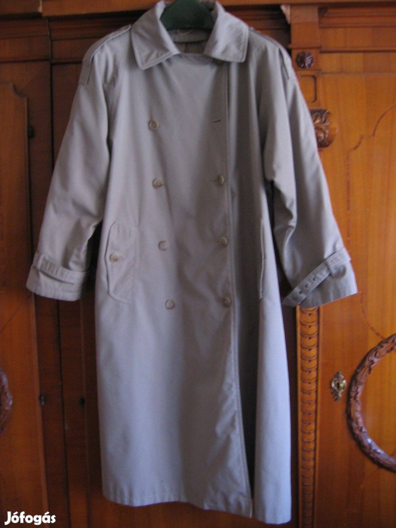 Új, ejtett vállú, vállapos, selyem béléssel, ujjában vékony szivacsbélés a selyem alatt. Méretei: teljes hossz 113 cm, váll szélesség kb.43 cm, ujja hossza kb. 56 cm a raglán fazon miatt. Öv nélkül.