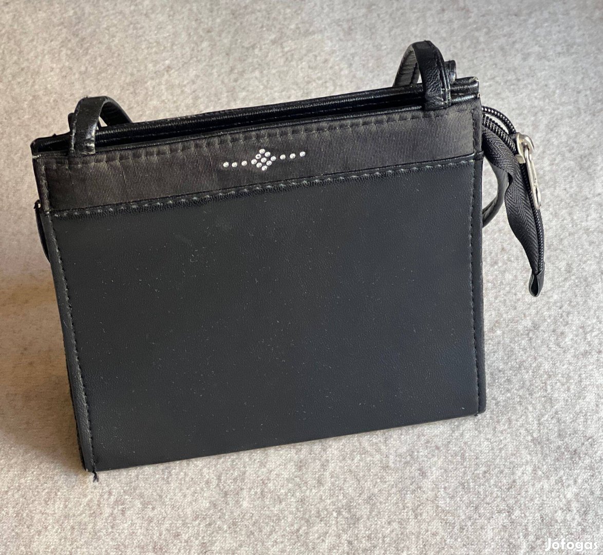 Nagyon elegáns selyemszövettel és strasszokkal szolidan díszített kézi táska. Kemény jó tartású, belseje egyterű, kis oldal zsebbel, tiszta, elegáns cipzárral záródó darab.