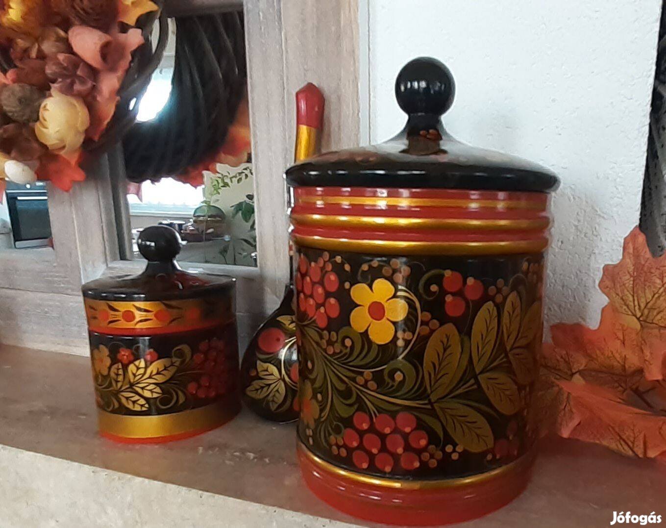 orosz Khokhloma kézzel festett lakkozott fa fedeles dobozok és fakanál, gyönyörű termékek még ajándéknak is. Az egyik 8 cm, a másik 15 cm magas.