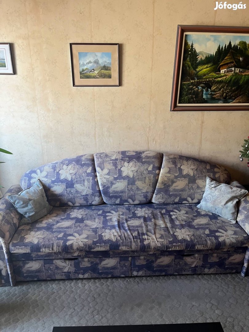 Eladó a képen látható ülőgarnitúra. Ágyneműtartós kinyitható kanapé, két fotel és díszpárna. Szállításban nem tudok segíteni.