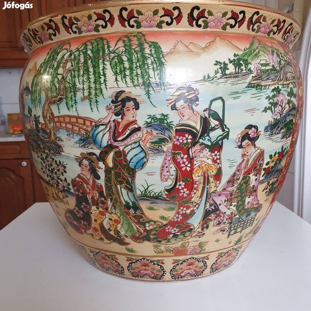 Eladó egy vintage kínai Satsuma stílusú porcelán kaspó, kézzel festett, udvari jeleneteket ábrázolva, kimonós alakokkal!