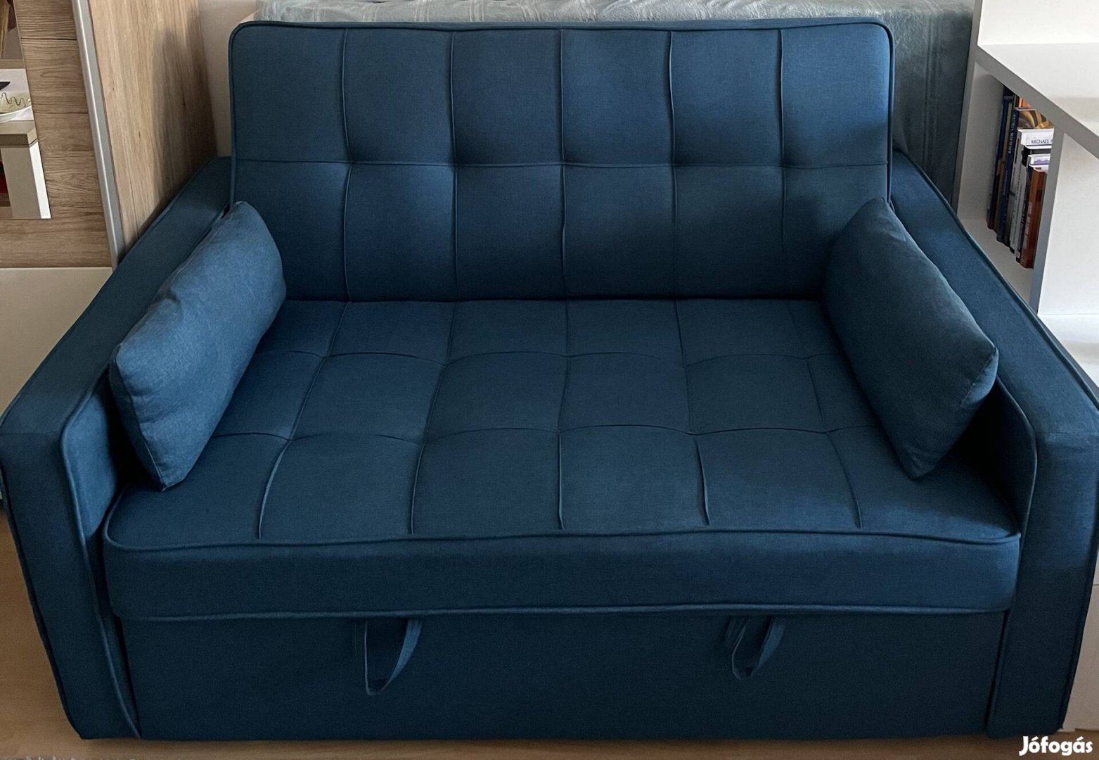 Költözés miatt eladó a képen látható türkiz színű kétszemélyes kinyitható kanapé.