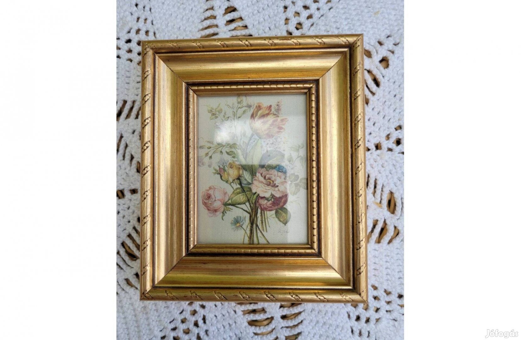 Eladásra kínálom a képen szereplő dúsan aranyozott fa keretes-üveglapos kis selyemképet. A képek magukért beszélnek. Körbe fotóztam.