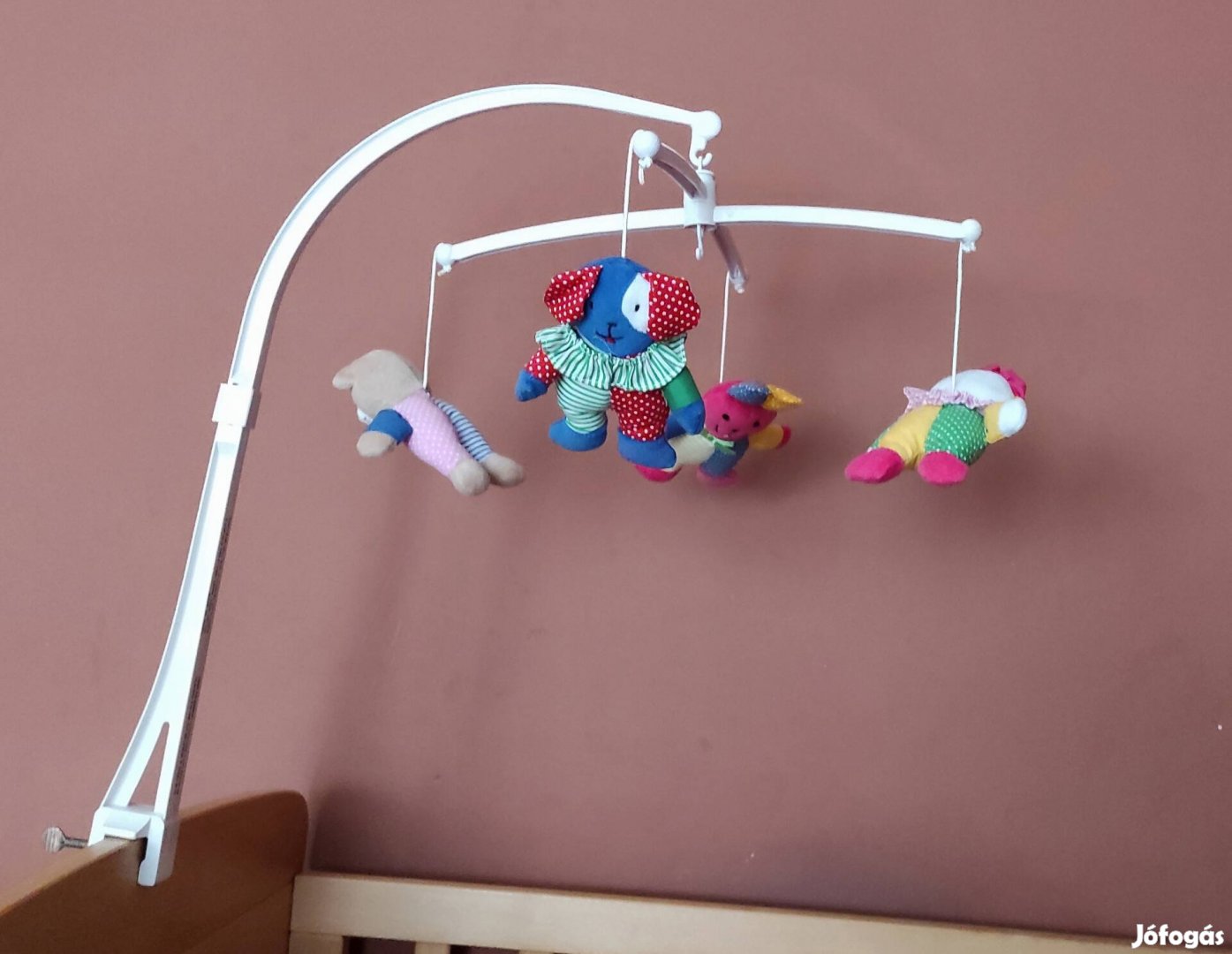 Kiságyra szerelhető zenélő körforgó, plüssfigurákkal.