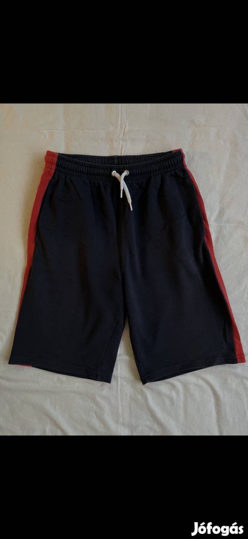 Eladó egy H&M-ben vásárolt 152-es méretű kisfiú rövidnadrág. Színe sötétkék, piros csíkkal az oldalán.