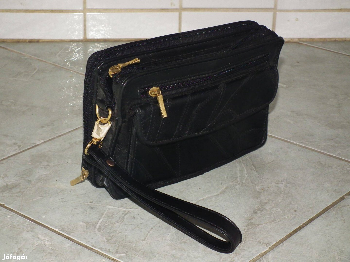 Új valódi bőr és műbőr, 23 x 14 x 5 cm., belül 2 cipzáras az egyikben cipzáras zseb a másikban (körbecipzáras) kártyatartók + cipzáras zseb. Kívül 1 cipzáras + 1 patentos zseb. Made in China.