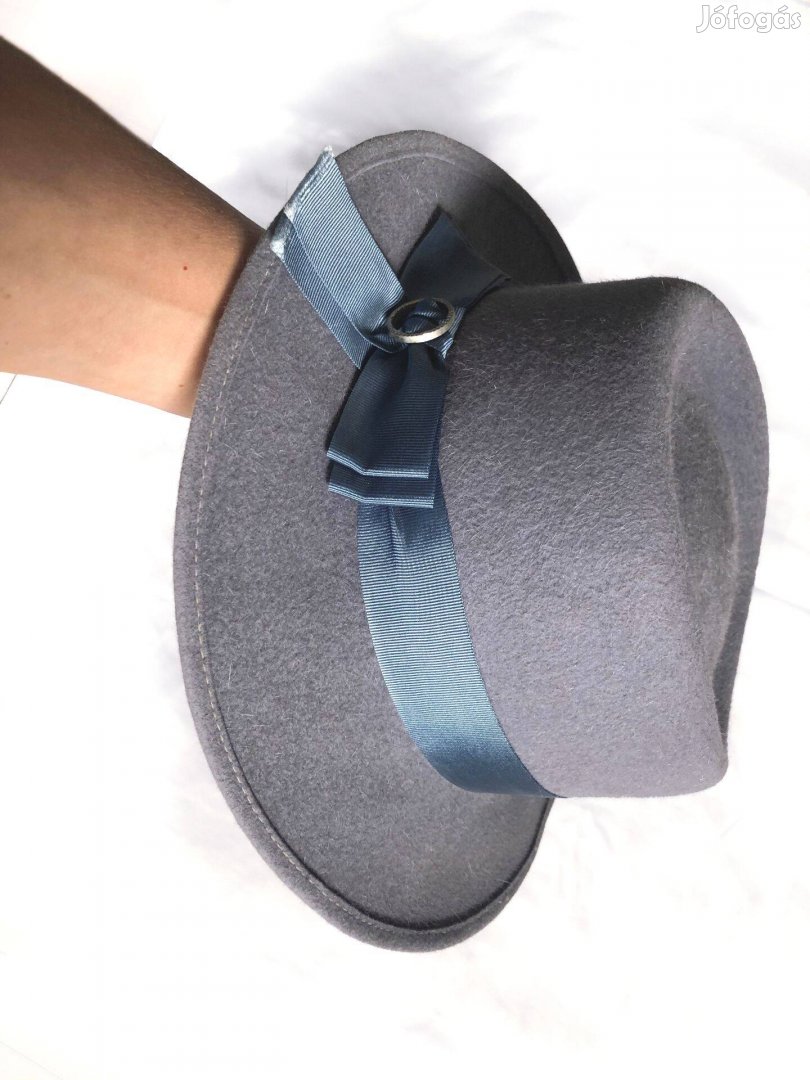 Elegáns, Minőségi, kitűnő, melusine nyúlszőr (angora) kalap. A színe is elegáns finom kékesszürke, halvány kék szalagdísszel.
