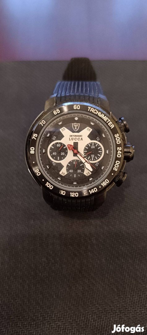 Eladó egy kiváló állapotú Detomaso Lucca típusú férfi karóra. Fekete acél tok, korona nélkül 44 mm, koronával 48 mm. Fekete szilikon szíj, jelzett csattal. Jelzett csat. 24 órás mutató, kronográf funkció. 10 ATM. VD54 szerkezettel. Szinte hibátlan állapotban, a menetes hátlap enyhén karcos. Személyesen megtekinthető Káposztásmegyeren vagy egyeztetés után Budapesten vagy előre utalás után küldöm is.