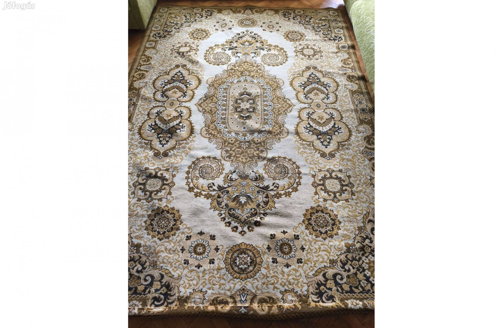 Eladó egy mintás szőnyeg.Korának megfelelő állapotban. Nincs nagy kopás vagy sérülés.Szín és minta:klasszikus mintázat,semleges árnyalatok,könnyen illeszthető bármilyen lakásba.Méret 200x280cm-ideális nappaliba,hálószobába vagy étkezőbe.