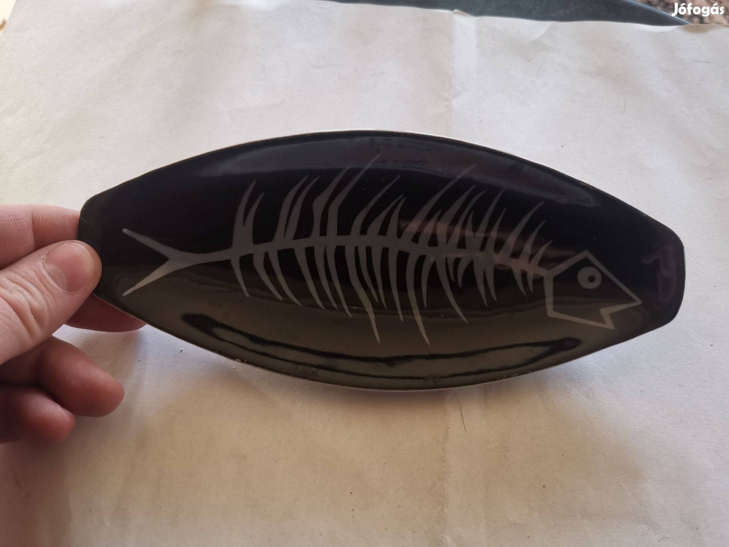 A peremen a fekete festékben kisebb kopásnyomok vannak, továbbá 1 milliméternyi alig látható lepattanás. 19,5cm hosszú, 8,5cm széles. 2cm magas