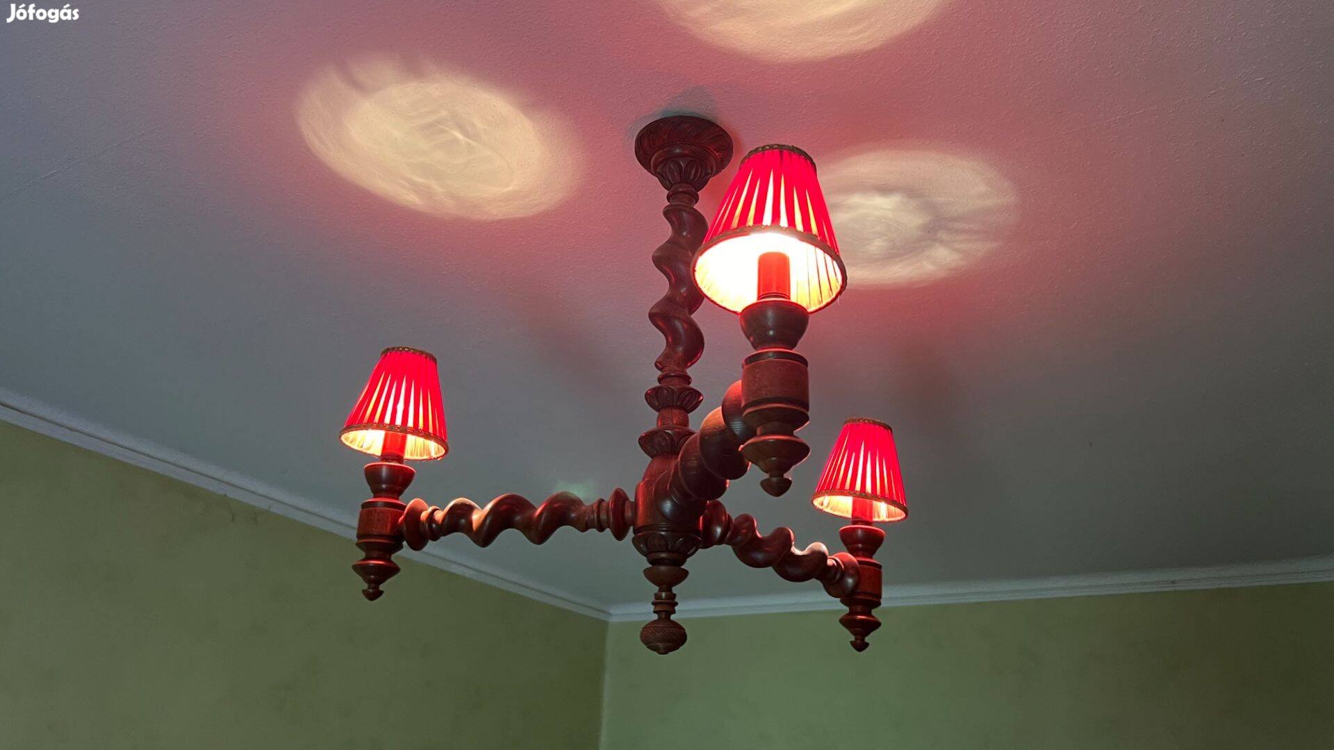 Eladó klasszikus stílusú, koloniál 3 ágú fa csillár piros lámpa búrákkal.