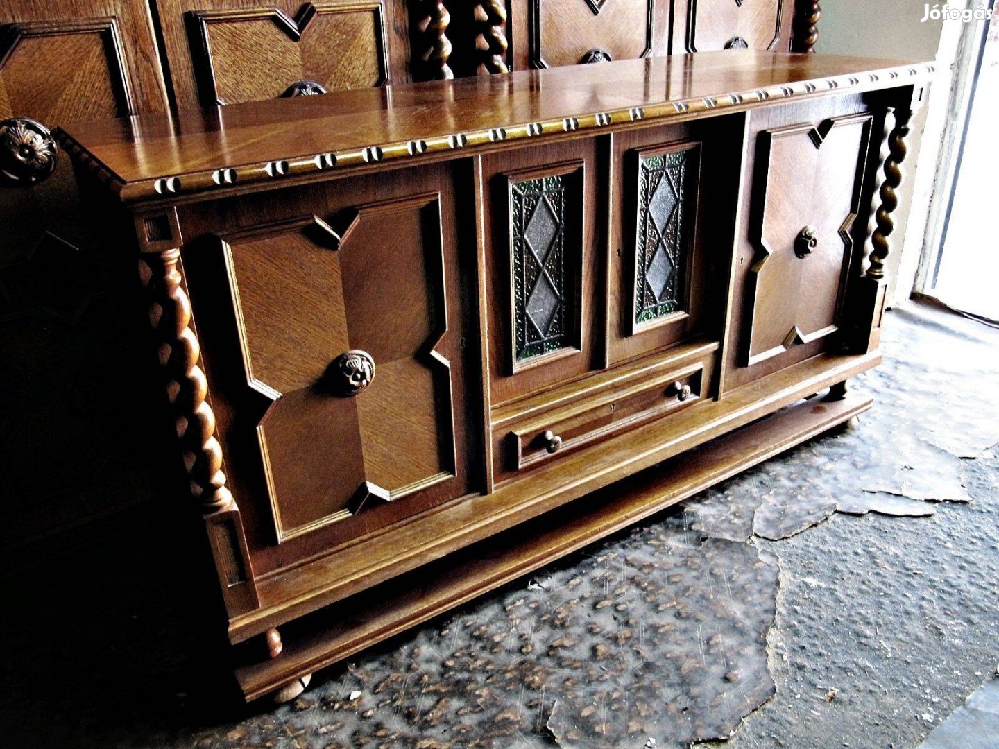 Eladó a képeken látható,impozáns méretű koloniál komód tálaló,középen 2 ólomüveg ajtóval.
