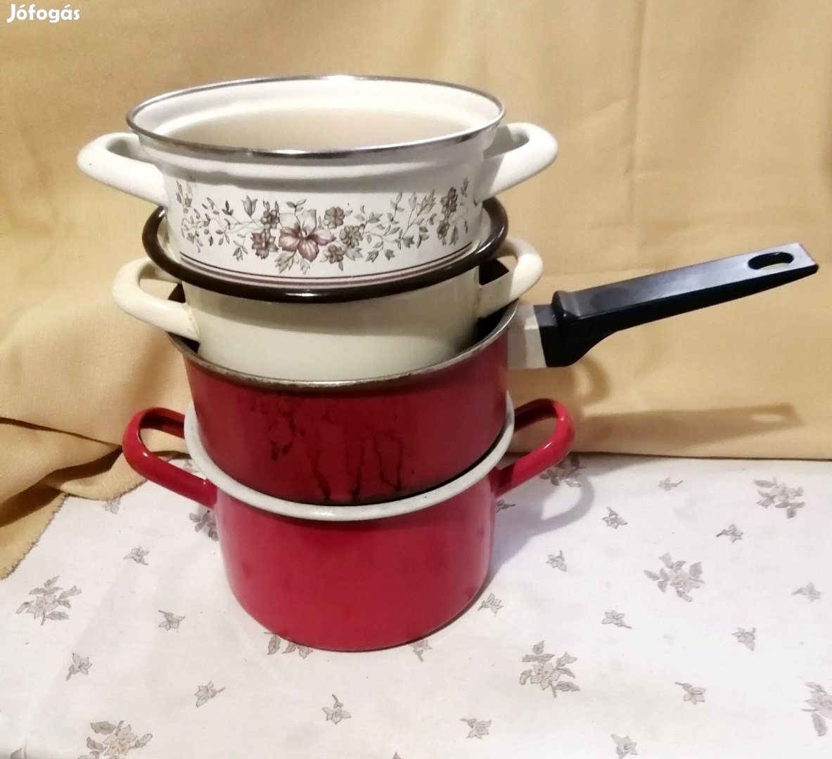 Eladók a képen látható lábos 2,800.-Ft. + gázgyújtó, hústűk, kávékiöntő, késkészlet, lábosok, tepsik, poharak stb.