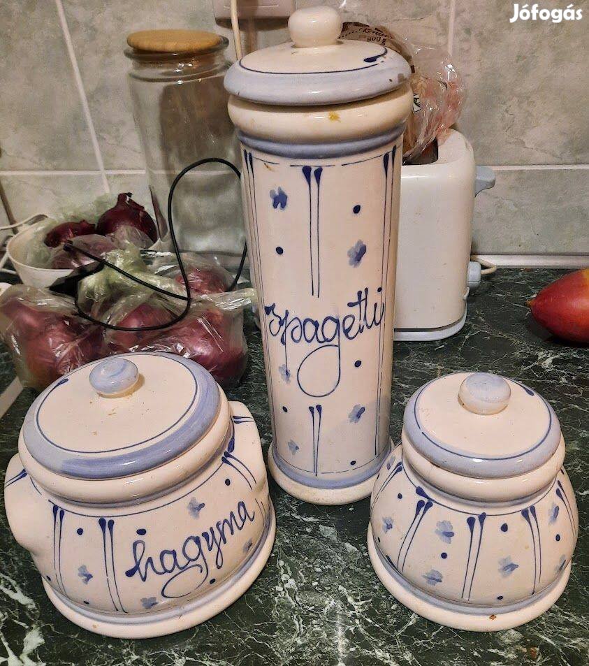 Eladó 3 db-os kék-fehér kerámia tároló, hagymának, spagettinek és bárminek a tárolására.