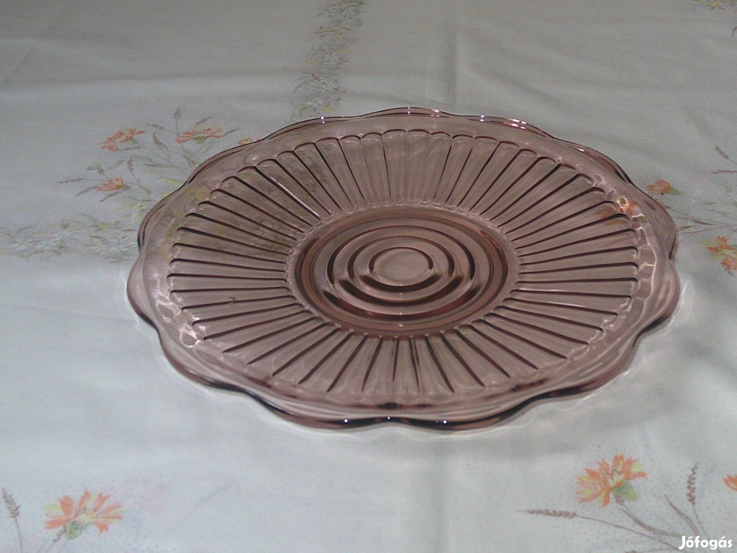 A képen látható korall színű üveg süteményes tál, asztalközép eladó.