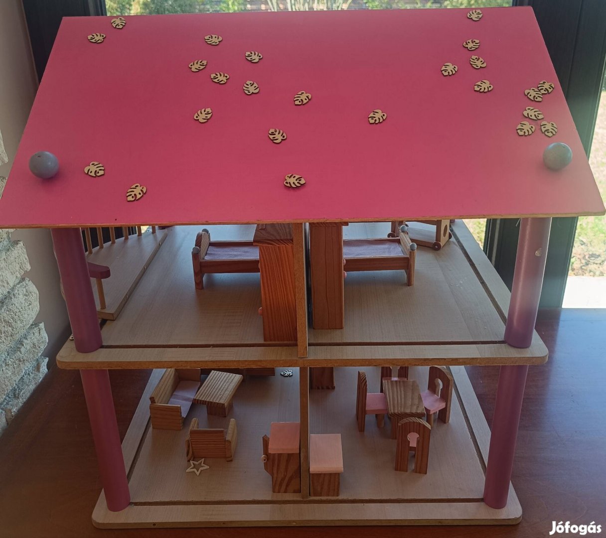 Fa babaház teljes berendezéssel, apával, anyával, 2 gyerekkel.