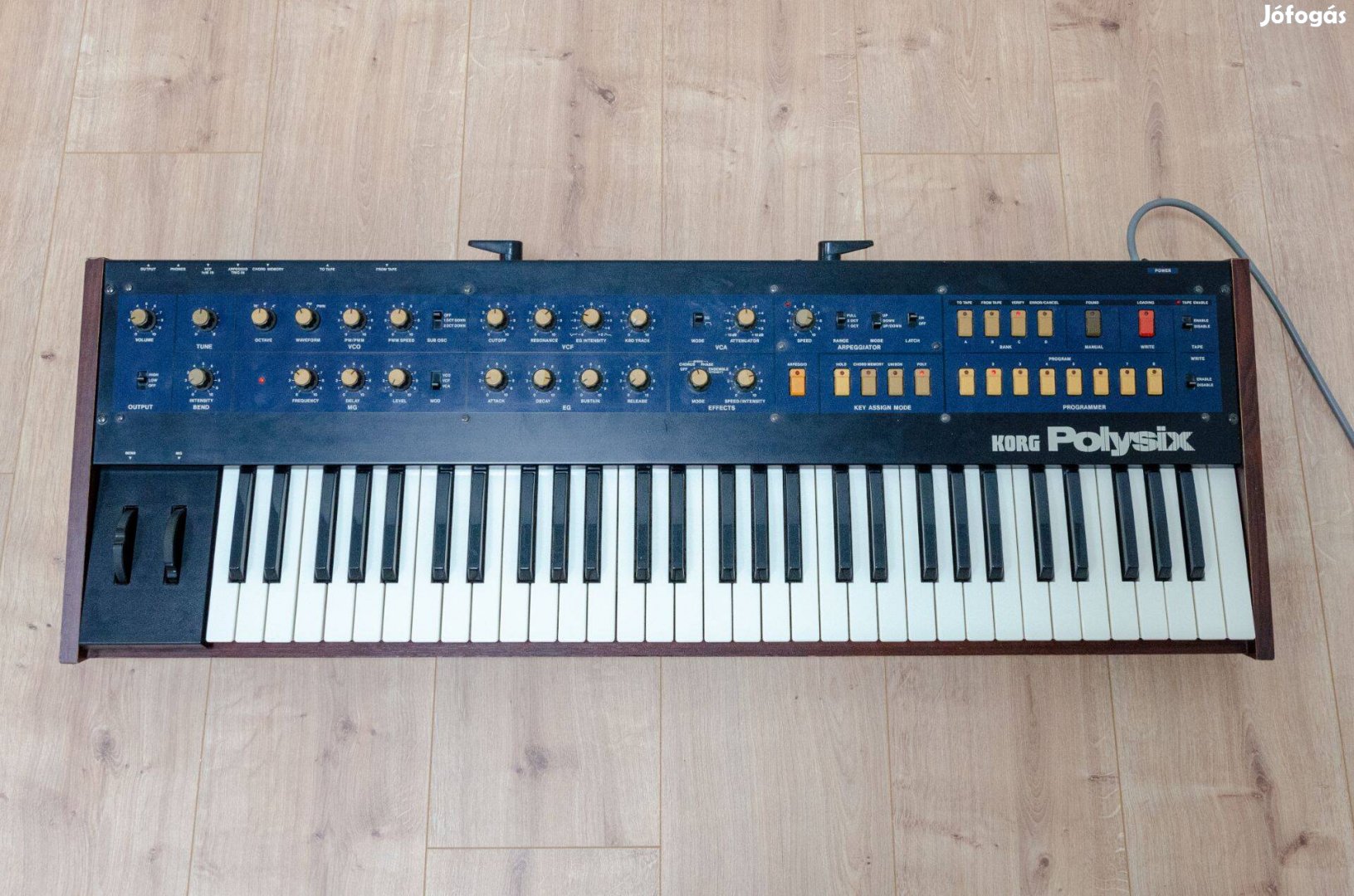 Eladó a képeken látható Korg Polysix analóg szintetizátor. Az esztétikai hibáit lefényképeztem, korának megfelelő állapotú. Az eredeti elem a szintetizátor típushibájának megfelelően korrodálódni kezdett, így még azelőtt ki lett cserélve Ni-Cd akksira, hogy kifolyt volna. Az arpeggiatornak kell 30-45 perc bemelegedési idő, hogy normálisan üzemeljen. Ezen kívül minden funkciója hibátlan.