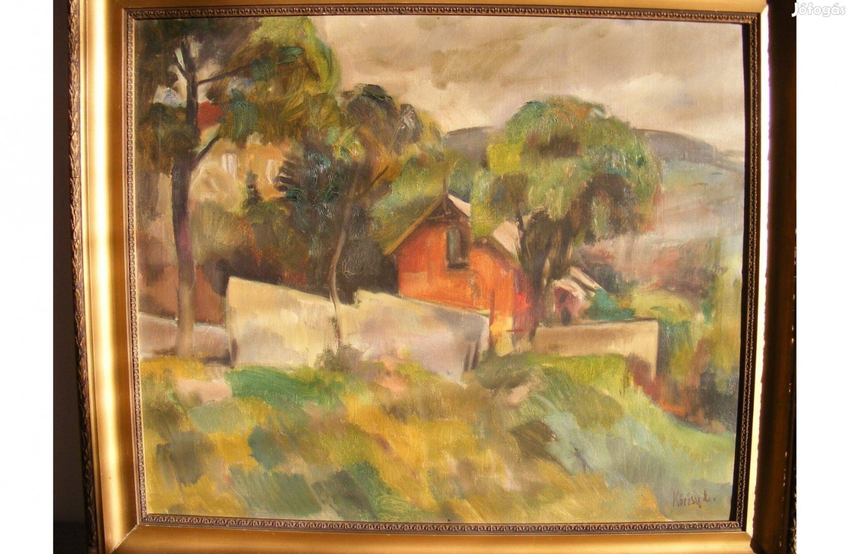 Olaj-vászon technikával készült, korának megfelelő állapotú festmény, Vörös ház címmel, kissé sérült keretben. A hordozó ép, a kép maga tisztítást mindenképpen igényel, illetve kisebb felújítás is ráférhet. Családi örökség, szakértő nem ellenőrizte.