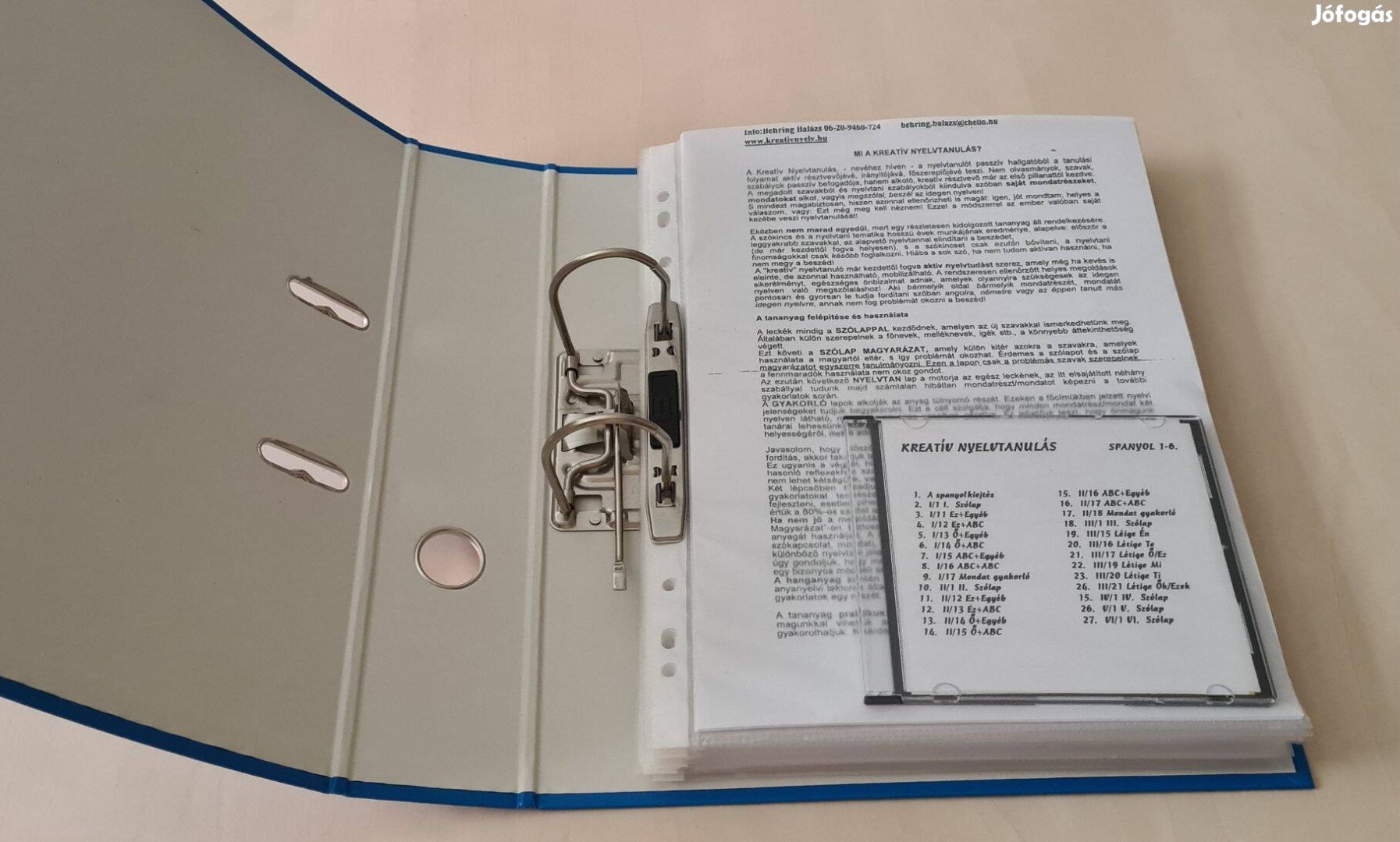 Kihasználatlanság miatt eladnám spanyol kezdő tananyagcsomagomat kedvező áron. Régebbi kiadás, de tanulni tökéletesen lehet belőle, hátha valaki hasznát venné. A/4-es lapokból áll, kb. 200 oldal. Egy lemezen a hanganyag mp3-ban. Már nem az eredeti dossziéban van, hanem mappában, de természetesen hiánytalan. Budapesten személyes átvétel lehetséges Pestszentimrén (XVIII. kerület), Gyálon, Petőfi híd budai hídfő - Boráros tér -Corvin negyed villamosmegállóknál, illetve Kőbánya Kispest és Határ út metróállomásoknál. Vidékre előre utalás postázom (MPL, Foxpost). Utánvét nincs! Máshol is hirdetem!