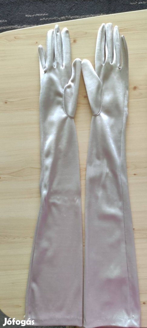 Krémszínű, alkalmi, elegáns, 1-es méretű, fényes, szatén hosszú női kesztyű. A nagyujj aljától 40 cm hosszú, könyék fölé ér. Rugalmas anyag. Operába, bálba, menyasszonynak tökéletes. A kesztyű ára 1.700.-Ft.