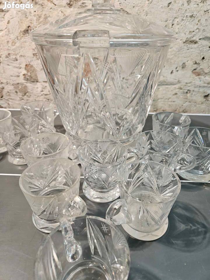 Eladó a képen látható kristály bólés tál, tetővel, és 11 darab pohárral, egy hibával az egyik pohár tetején egy pici csorba.