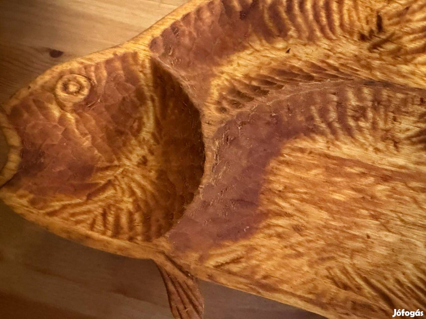 Kihasználatlanság miatt eladó egy kézzel faragott hal formájú tál, kínáló, tálaló, asztalközép. Három részre osztott, így a hal mellé külön lehet tálalni a köretet és a savanyúságot, szószt is.
