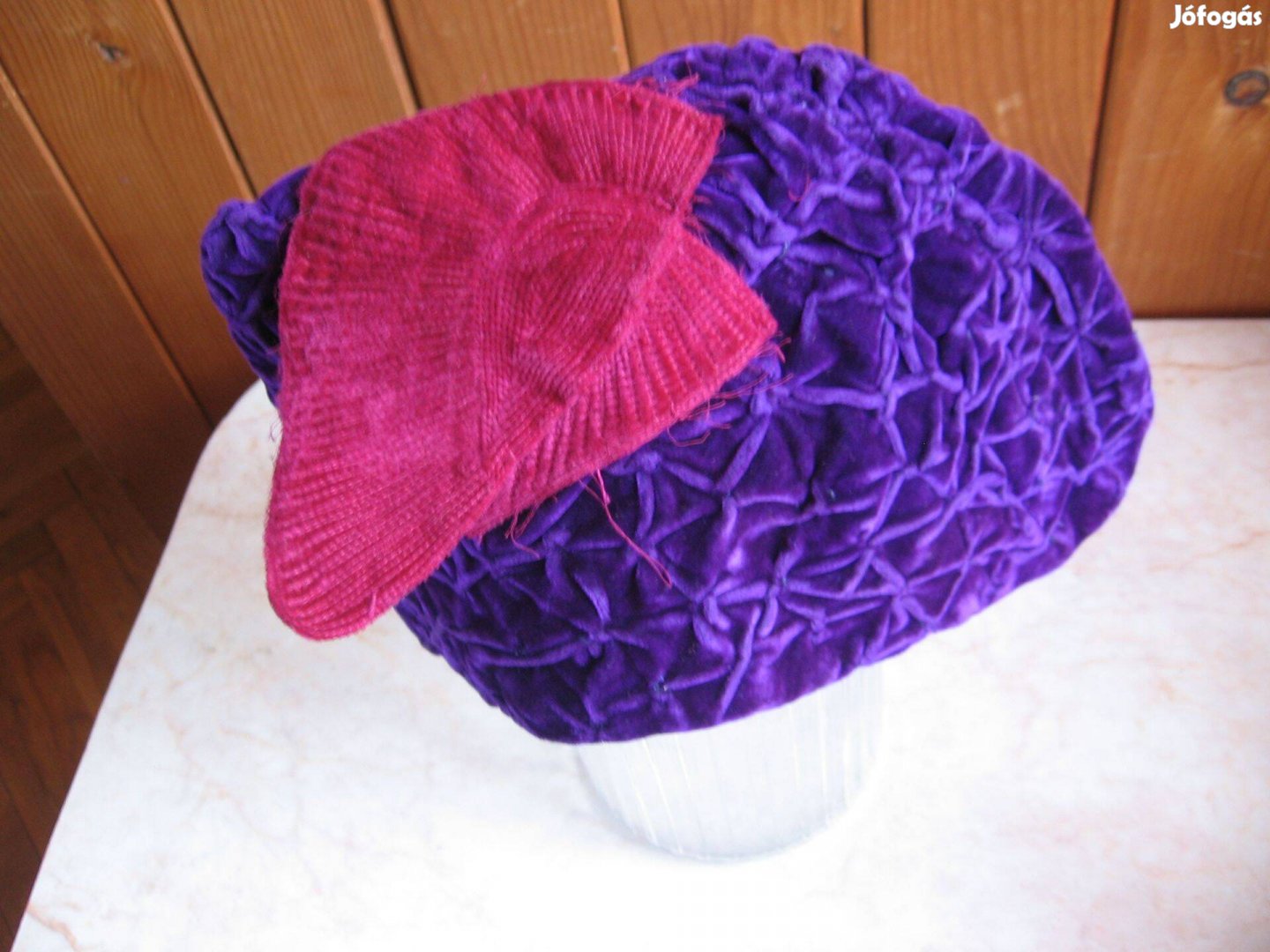 Lila, mintás bársony alap, rózsaszín kötött díszítés, belső fele vászonnal bélelve, kalapgumival.