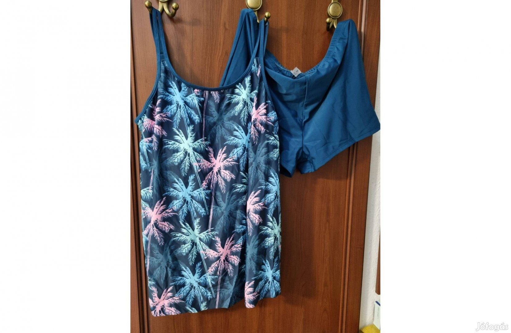 Különleges színű - acél- vagy türkizkék alapon - pálmafa mintás vadonatúj tankini XXL méretben eladó. Az alsó része rendkívül előnyös, pici szára van (takar és véd!). A melltartó része szivacsos, ami kivehető. XXL méret, kb.46-osnak felel meg. Csinos, dekoratív fürdőruha.