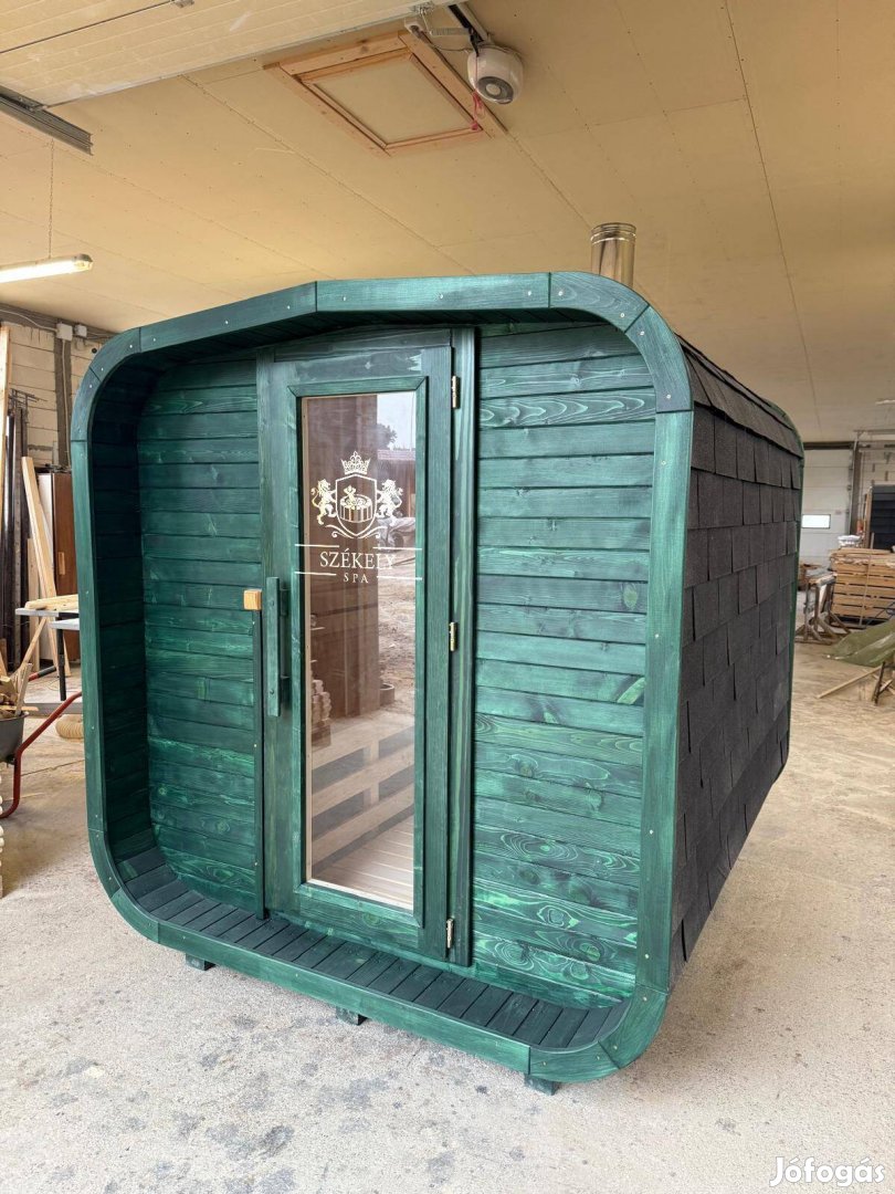 Kültéri használatra gyártott, masszív kivitelű szauna, amely valódi fa tüzelésű szaunaélményt biztosít, hosszú távú, intenzív használatra tervezve.