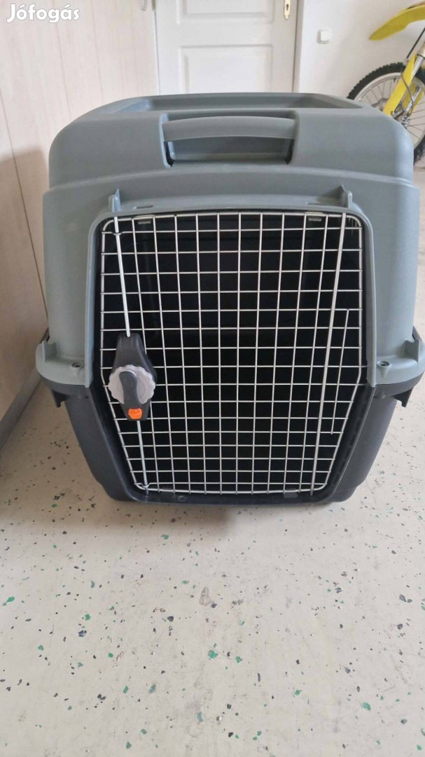 Tágas szállítóbox kutyáknak, IATA kompatibilis repüléshez, környezetbarát gyártás, zárható fémajtó, oldalsó csatokkal, itatótállal és hordozófogantyúval, újrahasznosított műanyagból. 5-ös méret: Sz 60 x M 81 x M 61,5 cm