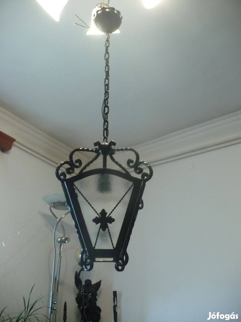 Láncos függesztéssel kovácsoltvas keretben üveglapos mennyezeti lámpa eladó, tökéletes darab, szem. átvét. 17. ker. Rcsaba, további termékek hirdetéseimnél.