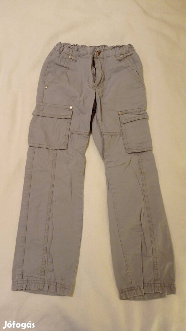 Coccodrillo tavaszi, átmeneti időre való vászon nadrág, lábszár része enyhén buggyos, sok zsebes, dereka gumis behúzóval, patentos gombbal, cipzáros. 7-8 éves korra. Posta megoldható.