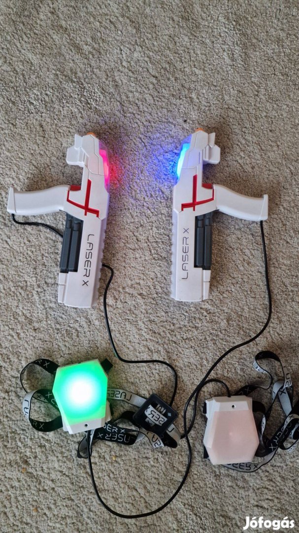 A szett tartalma: 2 db Laser-X pisztoly és 2 db vevőegység. A Laser-X játék fegyverek 3-3 db 1,5 V-os AAA/LR03 jelű elemmel működnek, melyet a csomagolás nem tartalmaz. A Laser-X infravörös sugarat használ, nem igazi lézert.