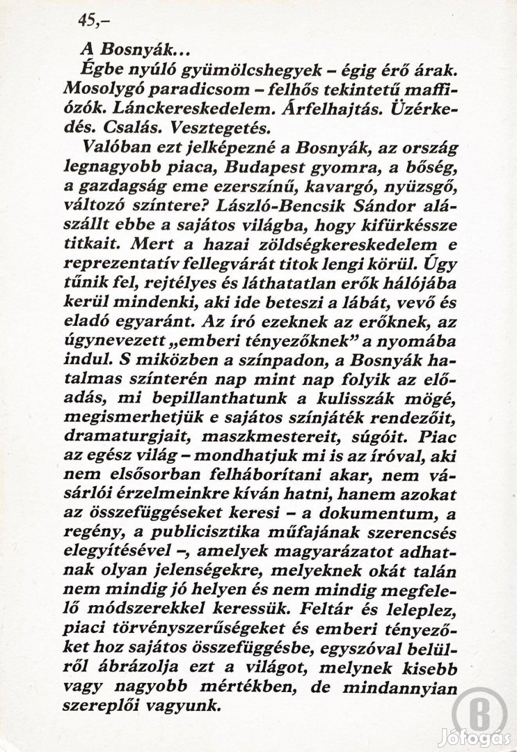 Valóban ezt jelképezné a Bosnyák, az ország legnagyobb piaca, Budapest gyomra, a bőség, a gazdagság eme ezerszínű, kavargó, nyüzsgő, változó színtere? László-Bencsik Sándor alászállt ebbe a sajátos világba, hogy kifürkéssze titkait.