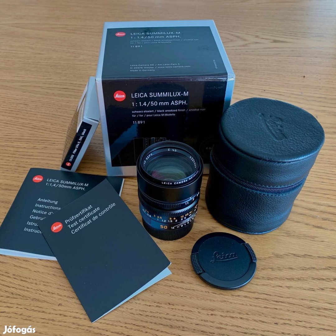 1.4/50 mm Asph. optikám fekete színben, újszerű állapotban, puha tokjában, papírjaival, dobozában. 6-digit verzió. Ajándék Leica UV szűrővel.