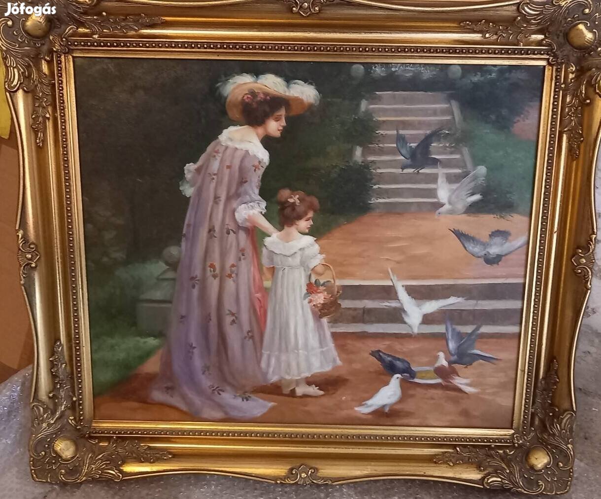 Különleges, romantikus hangulatú festmény, amely egy gyönyörű jelenetet ábrázol: finom, hosszú ruhát és kalapot viselő hölgyet, valamint kislányát, akik galambokat etetnek a park lépcsői előtt. A mű hangulatosan megfogja az anyai szeretet, a gondoskodás és a békesség pillanatát.