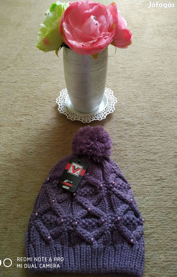 Lila kötött kövekkel díszített sapka új állapotú 2000 Ft-ért eladó.