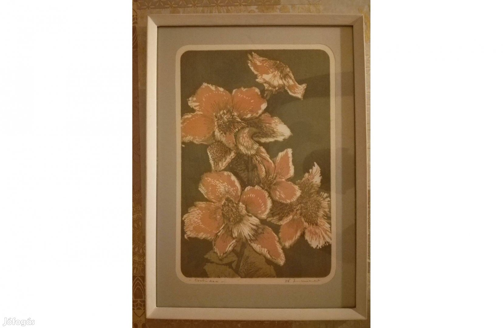Linóleum metszet, Orchideák, Lunzer Anikó 1986. Keret 41 x 30 cm, kép 31 x 21 cm.
