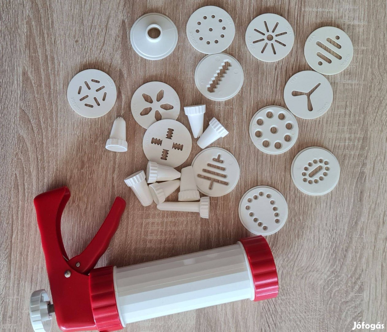 A kiszerelés tartalma: 1 db tésztakinyomó gép, 13 db kekszkészítő forma 6 db kinyomó forma