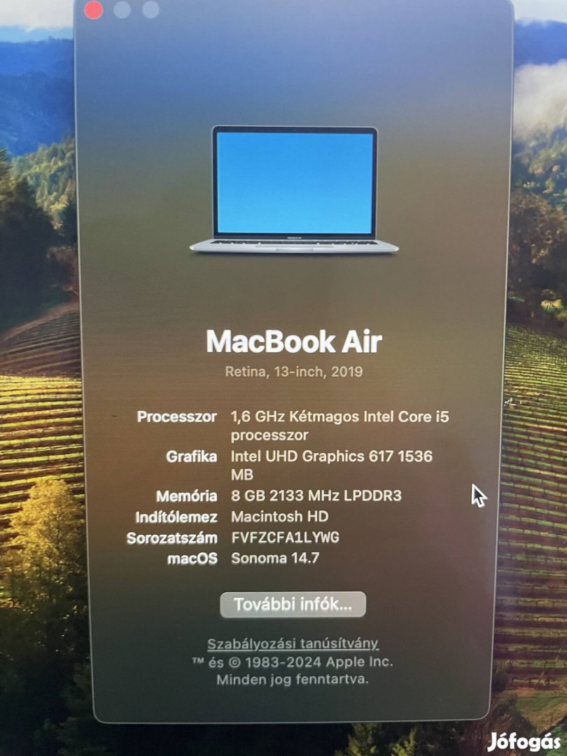 Eladó kitűnő állapotó, 2019-es évjáratú Macbook Air. Az összes csatlakozó, a magyar kiosztású billentyűzet, és a kijelző is hibátlan. Külseje karcolás- és serülésmentes. Vásárlást igazoló, eredeti számlával.