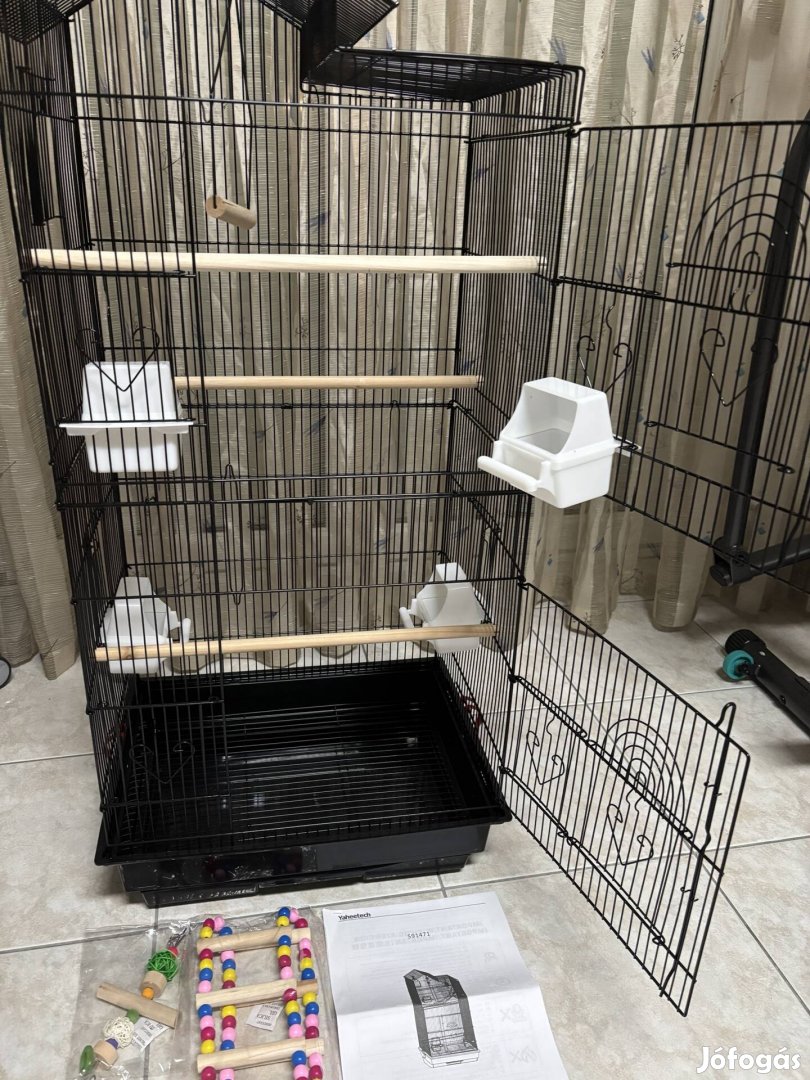 A papagájok, a kanári vagy más madarak számára, több bejárattal rendelkezik, sok tartozékkal.