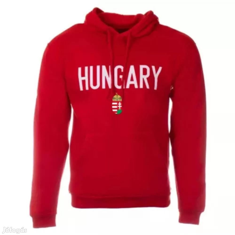 A pulóver piros színű, közepes (M) méretű, és a 'HUNGARY' felirat díszíti az elejét, míg a karján a magyar trikolor színei pompáznak.