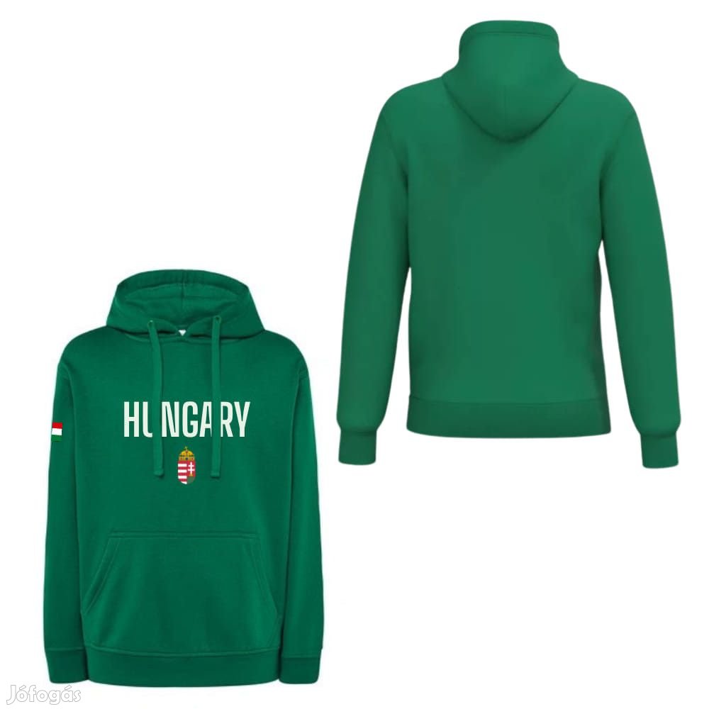 Klasszikus és hazafias stílus! Ez a kapucnis, zöld pamut pulóver a mellrészén Magyarország felirattal és a nemzeti címerrel készült. Kényelmes viselet mindennapokra, szurkoláshoz vagy sporthoz.