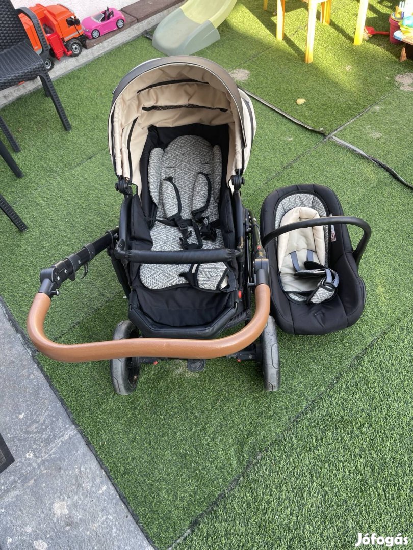 Eladó egy mama kiddies babakocsi. Fekete bézs színben. Keveset használtuk. Autós üléssel, újszülött szűkítővel. Bolygósítható az első 2 kereke es teleszkópos a hátsó. Tökéletes állapotban vannak az ülések, több pozícióba is lehet állítani a dőlését. Erős nagy, becipzározható csomagtartó. Sajnos a váza karcos a csomagtartóba ki-be pakolastól és összecsukástól, de az csak esztétika. Műbőr a kupola és a tolókar is. Előre is hátrafelé is lehet mindkettő ülést tenni