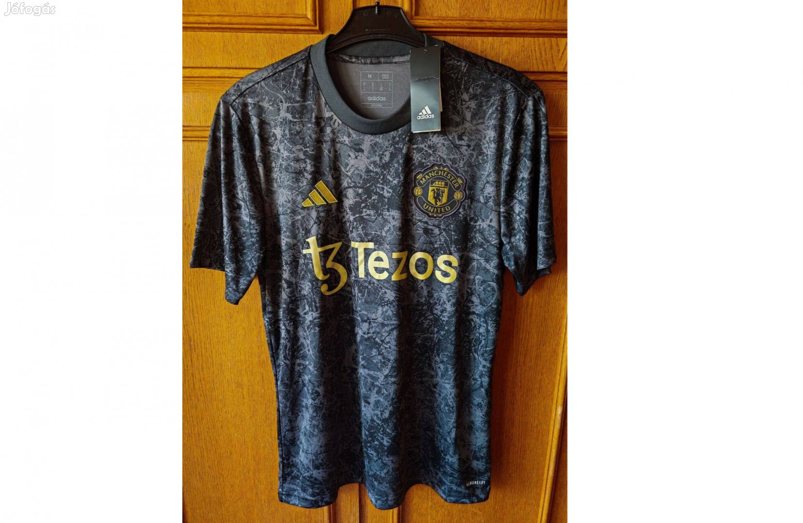 Elől adidas logó és Manchester United címer illetve T3 Tezos felirat