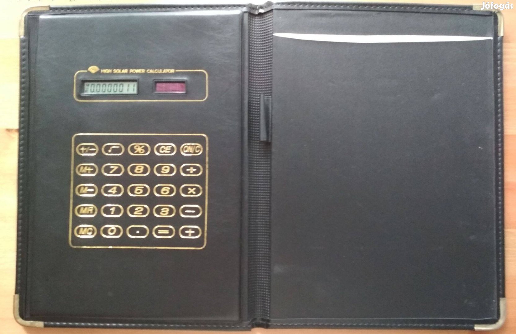 A 4-es méretű fekete mappa, nagy méretű napelemes számológéppel, jegyzettömb-tartóval, névjegykártyatartóval, fém sarokvédővel.
