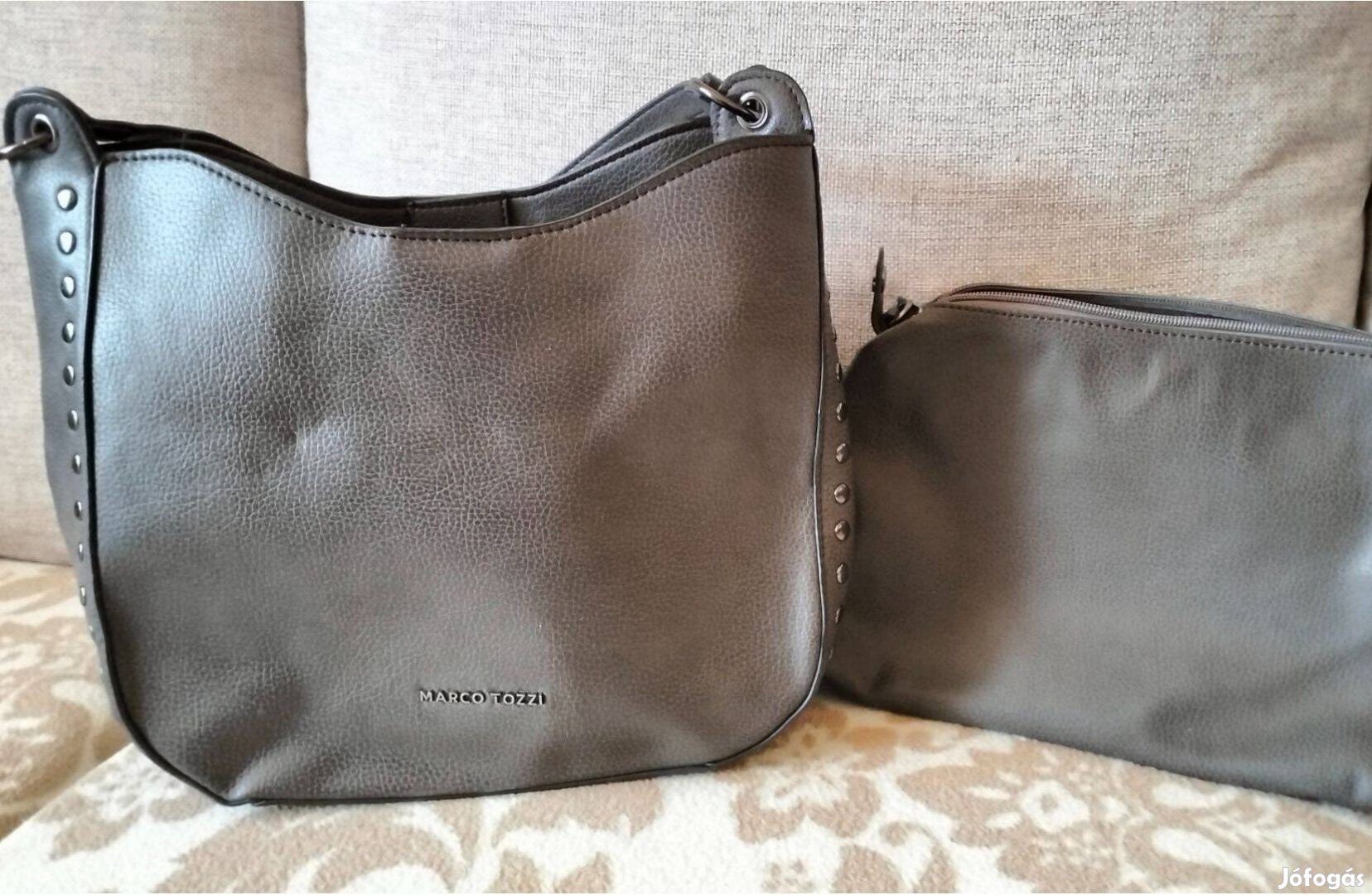 Modern, stílusos női válltáska a Marco Tozzi márkától, visszafogott szürke színben. Oldalát dekoratív szegecsek díszítik, a formája letisztult és elegáns. A táska belsejében egy kivehető cipzáras belső táska található, amely külön neszesszerként vagy kézitáskaként is használható.