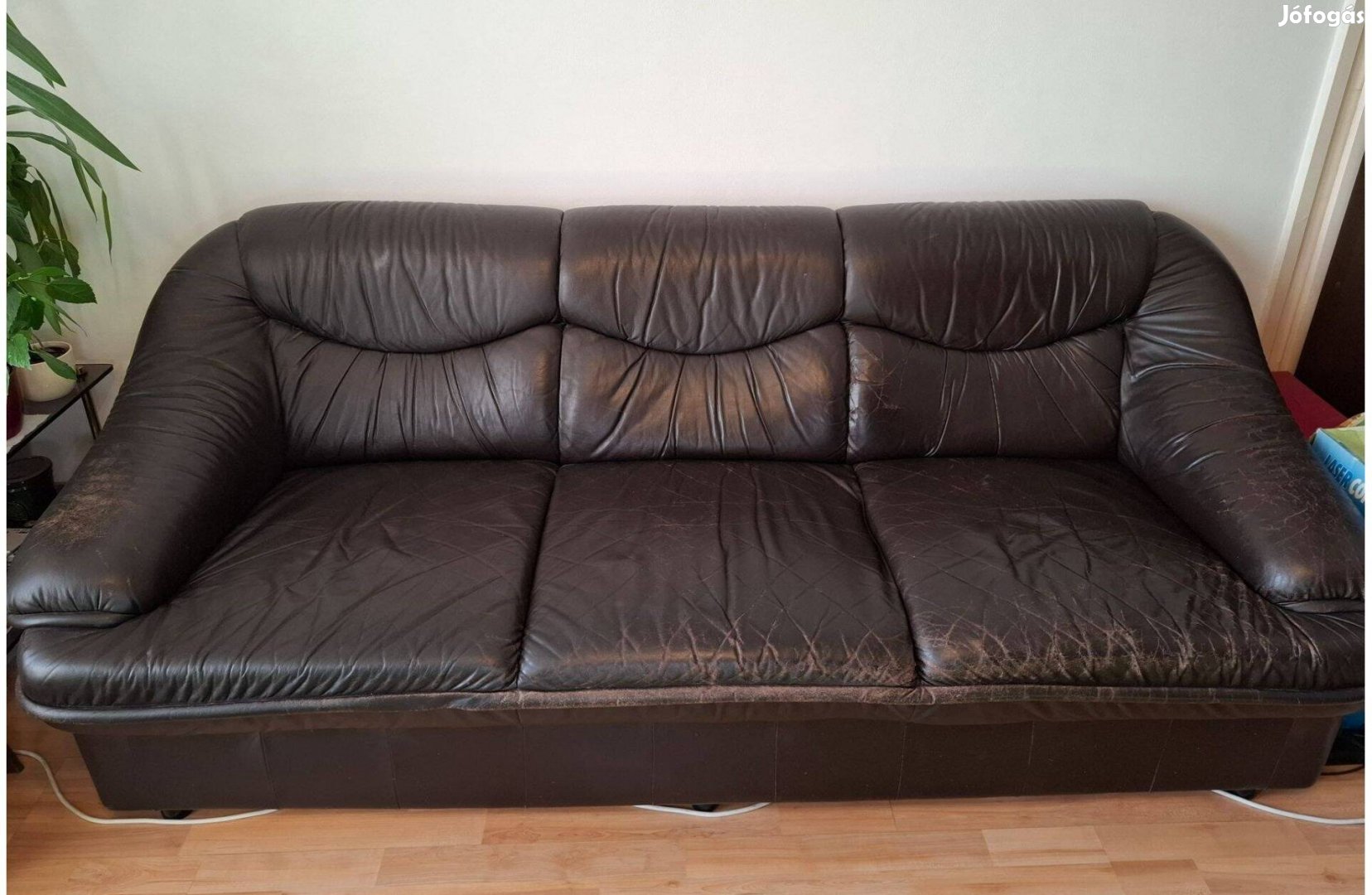Eladó valódi marhabör használt 3 személyes kanapé. A kartámla láthatóan hibás.