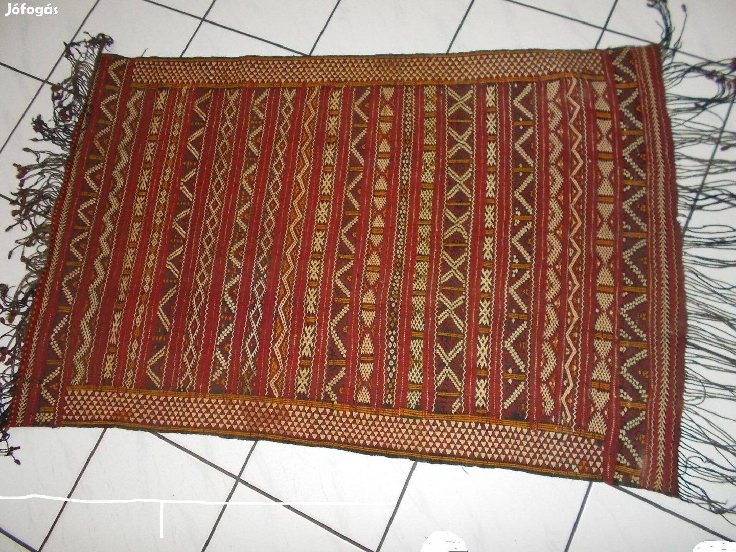 A képen egy kézzel szőtt, lapos szövésű szőnyeg látható, amely nagyon hasonlít a kilim típusú szőnyegekhez. Az ilyen szőnyegek gyakoriak Észak-Afrikában és a Közel-Keleten, különösen a Berber people (amazigh) népcsoport hagyományos szőnyegei között. 40 -70 éves lehet
