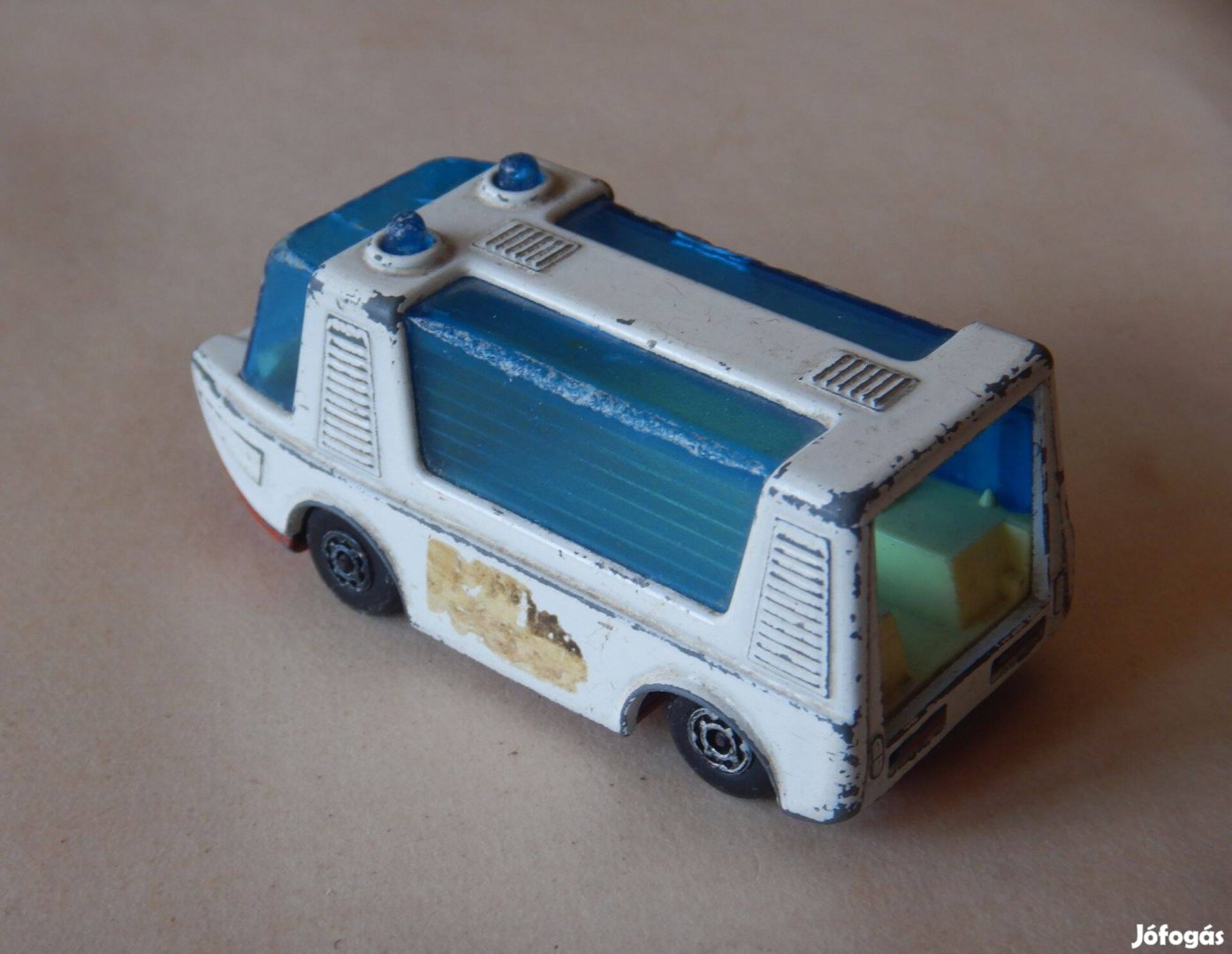 Vintage Lesney Matchbox Stretcha Fetcha mentőautó a képeken látható állapotban. A hátsó ajtó sajnos hiányzik róla. A két oldalfalon levő piros keresztet és Ambulance feliratot tartalmazó matrica teljesen lekopott. Az elülső üveg repedt. Angliában készült, 1971-ben.